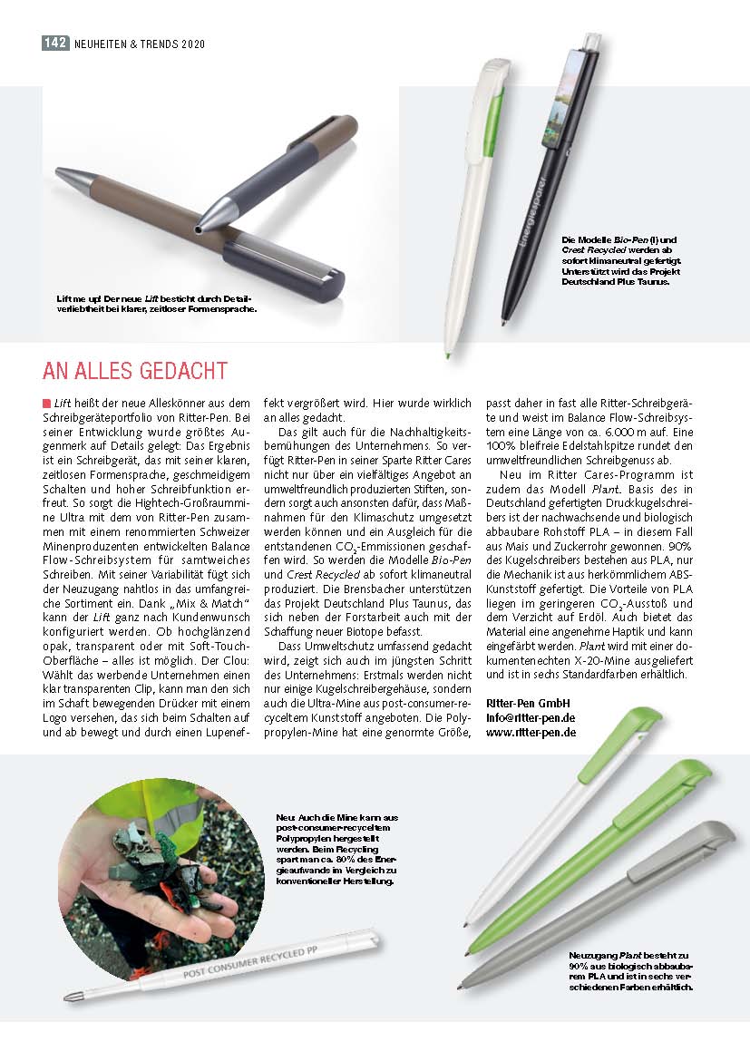 Das gilt auch für die Nachhaltigkeitsbemühungen des Unternehmens. So verfügt Ritter-Pen in seiner Sparte Ritter Cares nicht nur über ein vielfältiges Angebot an umweltfreundlich produzierten Stiften, sondern sorgt auch ansonsten dafür, dass Maßnahmen für den Klimaschutz umgesetzt werden können und ein Ausgleich für die entstandenen CO2-Emmissionen geschaffen wird. So werden die Modelle Bio-Pen und Crest Recycled ab sofort klimaneutral produziert. Die Brensbacher unterstützen